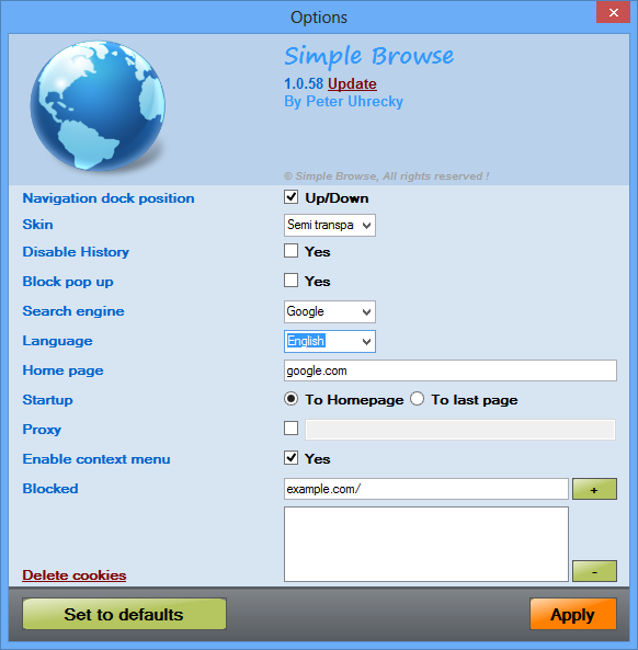 Разработчиком программы является Peter Uhrecky, который выбрал простоту как основной принцип дизайна. Браузер распространяется бесплатно под лицензией FreeWare, что делает его доступным для любого пользователя. Несмотря на англоязычный интерфейс, особых трудностей с пониманием не возникает благодаря очевидной структуре элементов. Поддерживается работа на всех актуальных версиях Windows, включая 7, 8.1, 10 и 11 как в 32-, так и в 64-битных системах.