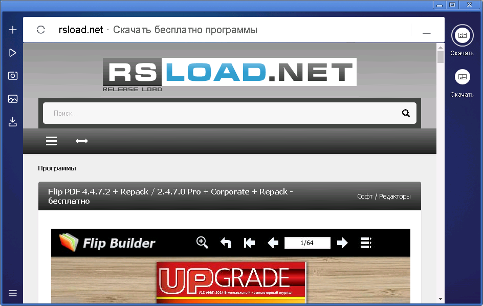 - Боковая панель включает видеоплеер, менеджер загрузок и инструменты для работы с изображениями
