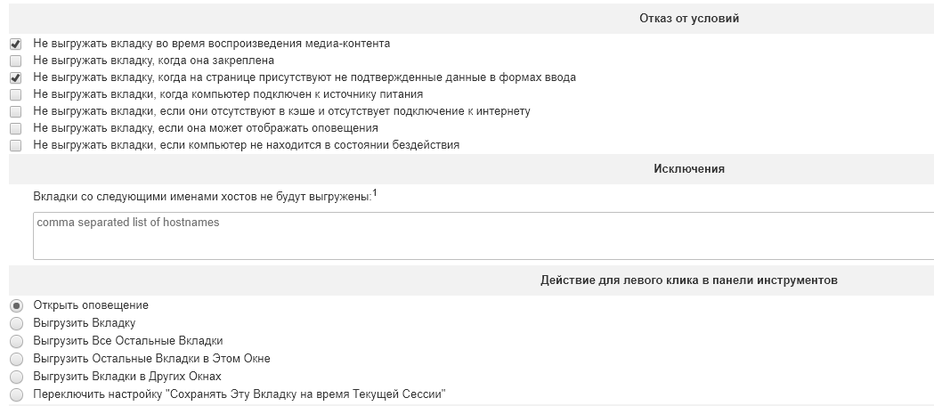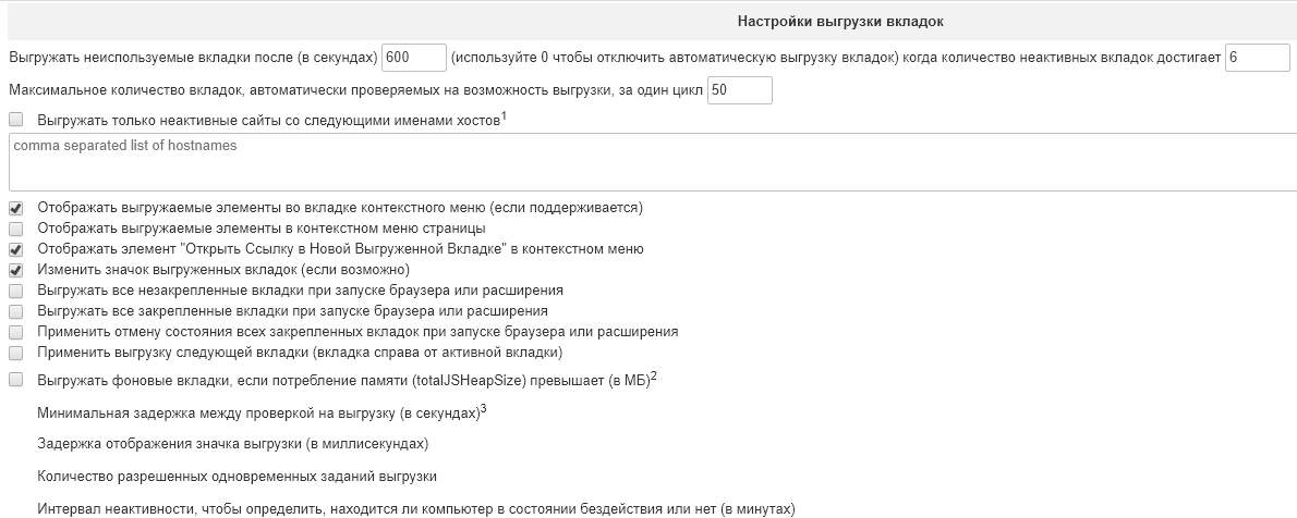 - Автоматически выгружает неактивные вкладки через заданный промежуток времени