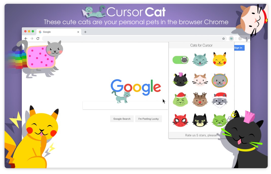 Курсор Кот 3.2.18 — это весёлое расширение для Google Chrome, которое позволяет увидеть анимированного кота, следующего за курсором по экрану. Программа разработана для пользователей всех возрастов, особенно привлекательна она выглядит для любителей кошек и тем, кто ищет простую радость в повседневной онлайн-жизни. Анимированный персонаж появляется сразу после установки и начинает взаимодействовать с движениями мыши, создавая ощущение живого присутствия на мониторе.