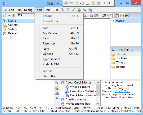 Quick Macros 2.4.12.2 — это мощное приложение для автоматизации задач в операционной системе Windows, позволяющее создавать макросы для клавиатуры и мыши, настраивать горячие клавиши и выполнять повторяющиеся действия без участия пользователя. Программа поддерживает запись действий, редактирование скриптов и расширенное управление процессами. Скачать Quick Macros можно в последней версии для различных сборок Windows.