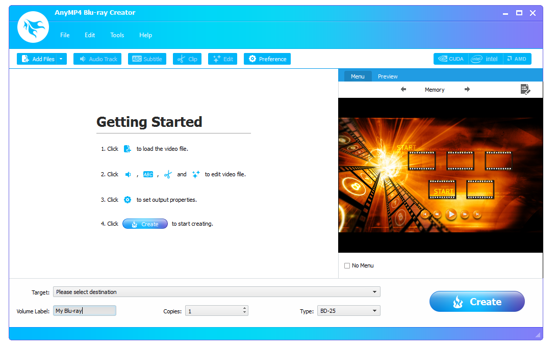 AnyMP4 Blu-ray Creator — программа для записи и редактирования видео в формате Blu-ray, поддерживающая различные исходные форматы и позволяющая создавать диски высокого качества с возможностью кастомизации меню, эффектов и звуковых дорожек. Программа поддерживает создание дисков BD-25, BD-50 и запись на перезаписываемые носители. Решение подходит как для домашнего, так и для полупрофессионального использования.
