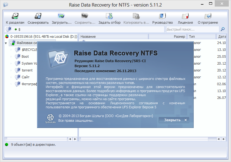 Raise Data Recovery 5.19.1 — программное обеспечение для восстановления утерянных файлов с жестких дисков, флешек, карт памяти и других носителей. Программа поддерживает работу с файловыми системами NTFS, FAT12, FAT16 и FAT32, обеспечивая высокую эффективность при поиске и извлечении данных. Благодаря интуитивному интерфейсу и встроенной русской локализации, инструмент подходит как новичкам, так и опытным пользователям, стремящимся провести recovery процесс без обращения в сервисные центры.