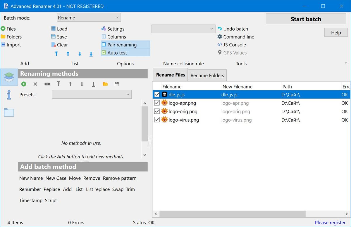 - Поддержка более десяти методов переименования файлов и папок, включая замену, удаление символов и изменение регистра