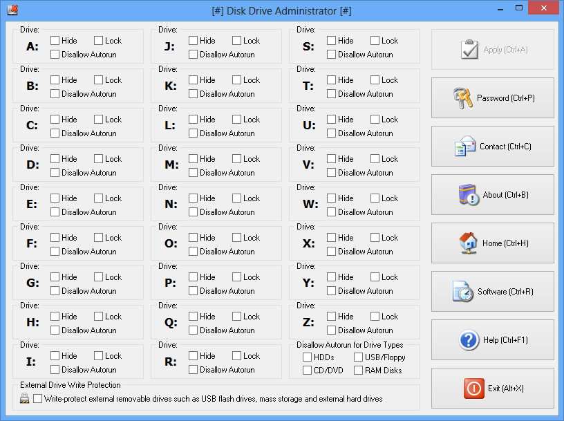 Принцип использования Disk Drive Administrator предельно прост. После запуска отображается список всех доступных дисков, отмеченных буквами. Пользователь выбирает нужные устройства и указывает требуемое действие — скрыть, заблокировать или отключить автозапуск. Также можно защитить саму программу паролем, чтобы сторонние лица не могли изменить настройки. После применения изменений они вступают в силу немедленно, без необходимости перезагрузки. Утилита не вмешивается в работу системы, работая в фоновом режиме и не нагружая процессор. Поддержка английского языка интерфейса не создаёт трудностей благодаря наглядной структуре элементов управления.