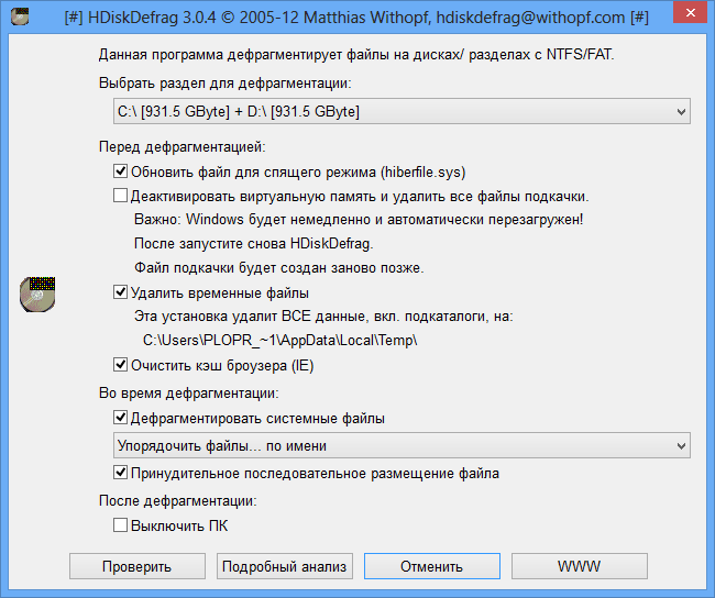 HDiskDefrag v3.0.5 — компактная и эффективная утилита для дефрагментации жестких дисков на компьютерах под управлением Windows. Программа доступна в портативных версиях для x32 и x64 систем, не требует установки и поддерживает русский язык интерфейса. Благодаря минимальному размеру и низкому потреблению ресурсов, HDiskDefrag помогает ускорить работу дисковой подсистемы.