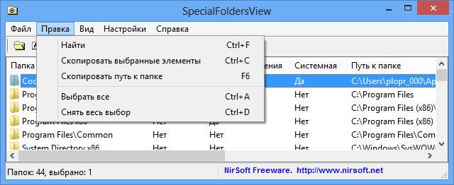 - Утилита отображает полный список специальных папок, используемых системой и приложениями
