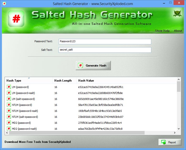 SaltedHashGenerator разработана компанией SecurityXploded и представляет собой компактное решение для работы с хэшированием паролей с применением соли. Утилита поддерживает ключевые криптографические алгоритмы, такие как MD5, SHA1, а также специфические форматы NTLM и LM, используемые в системах Windows. Размер программы составляет всего 1.18 МБ, что делает её лёгкой в установке и запуске даже на устройствах со слабыми характеристиками. Работает приложение исключительно в операционных системах семейства Windows.