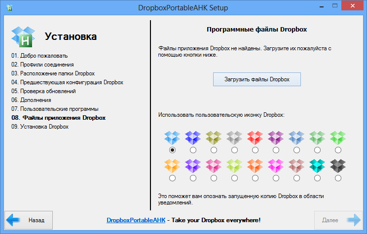 - Работает с оригинальным клиентом Dropbox, адаптированным под портативный режим