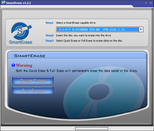 SmartErase 1.2.1 — это легковесная и бесплатная утилита, разработанная компанией Lite-On IT, предназначенная для полного и безопасного удаления информации с оптических дисков. Программа не требует установки и сразу готова к использованию после запуска, что делает её удобным инструментом для быстрой очистки носителей. Благодаря интуитивному интерфейсу и наличию нескольких режимов стирания данных, SmartErase подходит как для повседневного использования, так и для тех, кто заботится о конфиденциальности информации.