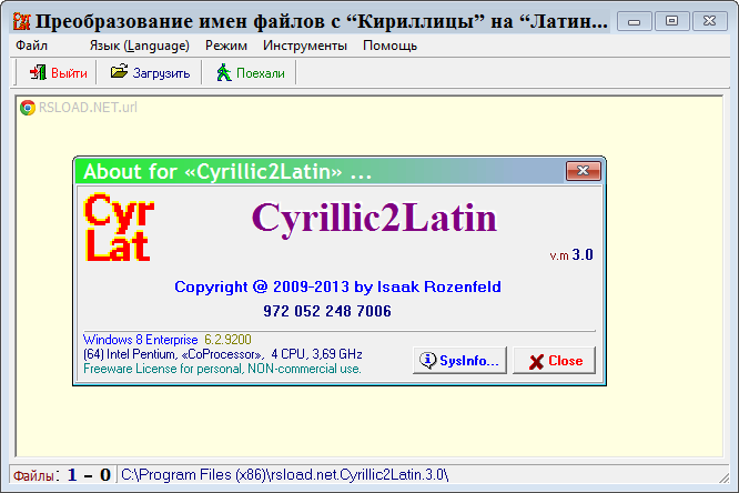 Утилита Cyrillic2Latin 3.0 разработана для автоматического переименования файлов, названия которых содержат русские буквы, в эквивалентные имена, написанные латинскими символами. Программное обеспечение создает транслитерацию кириллицы по стандартным правилам, что гарантирует предсказуемый и понятный результат. Благодаря минимальному размеру и отсутствию необходимости в инсталляции, программа может быть запущена с любого носителя, включая флеш-накопители, без следов в системе.
