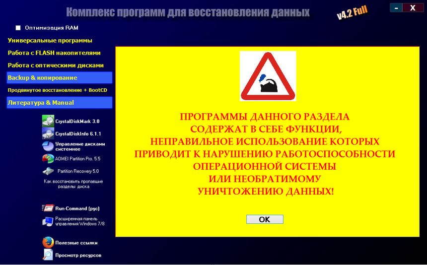 Представленный комплекс программ для восстановления данных — это тщательно подобранный инструментарий, объединяющий лучшие решения в области data recovery. Сборка разработана пользователем aleksey.RU и ориентирована на максимальную автономность и удобство при работе с повреждёнными носителями. Пользователю не требуется устанавливать каждый инструмент отдельно — все приложения собраны в одном компактном интерфейсе, из которого можно легко перейти к нужной утилите, ознакомиться с описанием и сразу приступить к восстановлению. Программы включают специализированные решения для жёстких дисков, SSD, флеш-накопителей, оптических дисков, карт памяти и других цифровых носителей.