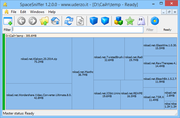 SpaceSniffer — это компактная и удобная утилита для визуального анализа занятого места на диске. Программа отображает содержимое накопителя в виде интерактивной карты, где каждый файл и папка представлены блоками, пропорциональными их размеру. Это позволяет быстро определить, какие объекты занимают больше всего дискового пространства.