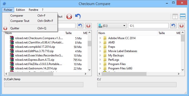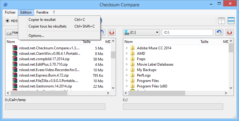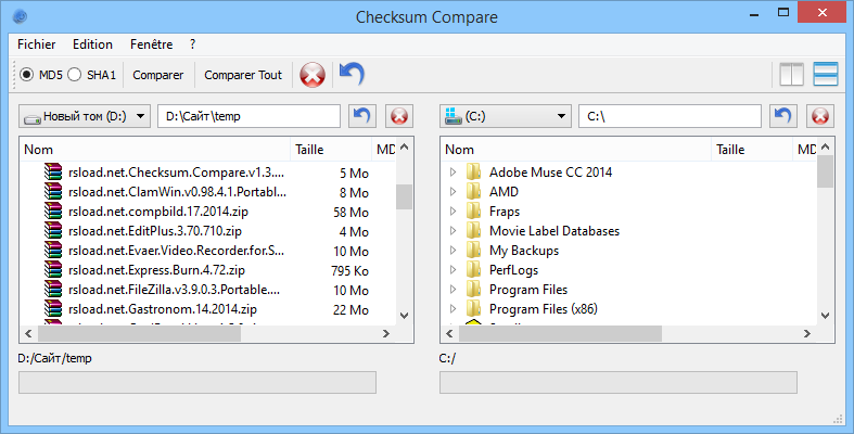 - Сравнивает папки и файлы по хеш-суммам MD5 и SHA1