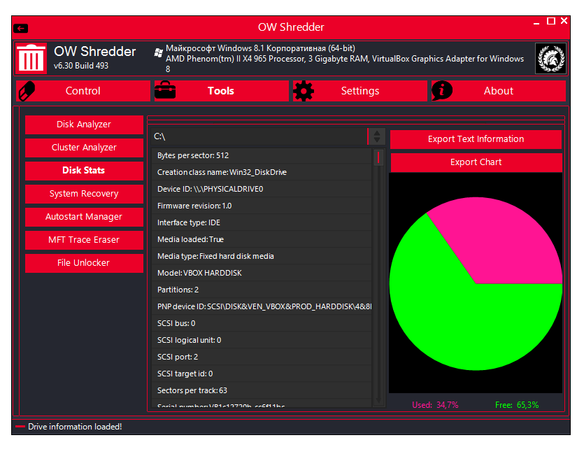 Использование OW Shredder 6.45.872 не требует глубоких технических знаний. После запуска приложения в основном окне пользователь выбирает тип операции: удаление отдельных файлов и папок или очистка целого раздела. Далее указывается нужный объект, после чего стартует процесс затирания. Программа позволяет проводить анализ состояния накопителя, проверяя заполненность и физическое состояние секторов. Дополнительно доступны инструменты для просмотра статистики дисков, а также управления программами, запускаемыми при загрузке системы. Все функции организованы в виде отдельных модулей в боковом меню, что упрощает доступ к нужным настройкам и операциям.