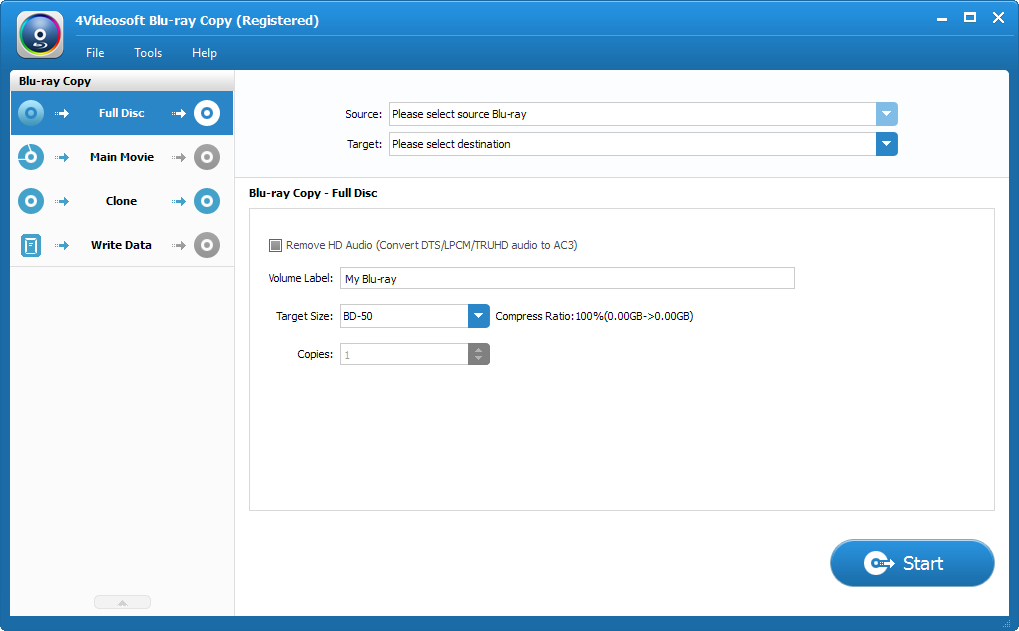 4Videosoft Blu-ray Copy разработана компанией 4Videosoft Studio как специализированный инструмент для копирования и резервного сохранения данных с Blu-ray носителей. Программа поддерживает различные режимы копирования: полное дублирование диска, запись образа ISO или копирование папки BDMV на жёсткий диск. Это удобно для пользователей, которые хотят сохранить любимые фильмы в цифровом виде, избежав износа физических дисков при частом использовании.