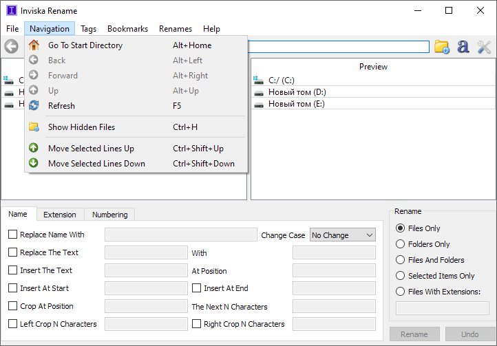 После запуска приложение отображает двухпанельный интерфейс: слева показаны исходные названия, справа — предварительный результат изменений. Пользователь может выбирать различные методы редактирования: полная замена имени, вставка префиксов и суффиксов, удаление части текста, замена слов или символов. Доступны инструменты для обрезки строки по позиции, добавления числовых последовательностей, изменения регистра (например, заглавные, строчные, капитализация). Для упрощения процесса предусмотрены готовые шаблоны, которые можно адаптировать под свои нужды. Также поддерживается работа с кавычками, пробелами и специальными символами. Благодаря портативной версии, Inviska Rename может использоваться без установки — достаточно запустить .exe-файл с флешки или другого носителя.