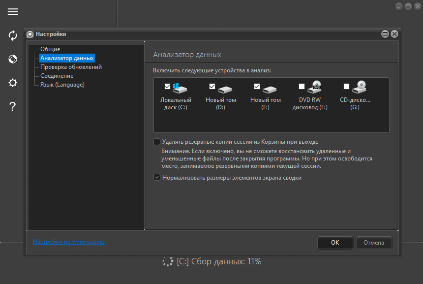 - Программа автоматически сканирует подключенные устройства хранения данных после запуска