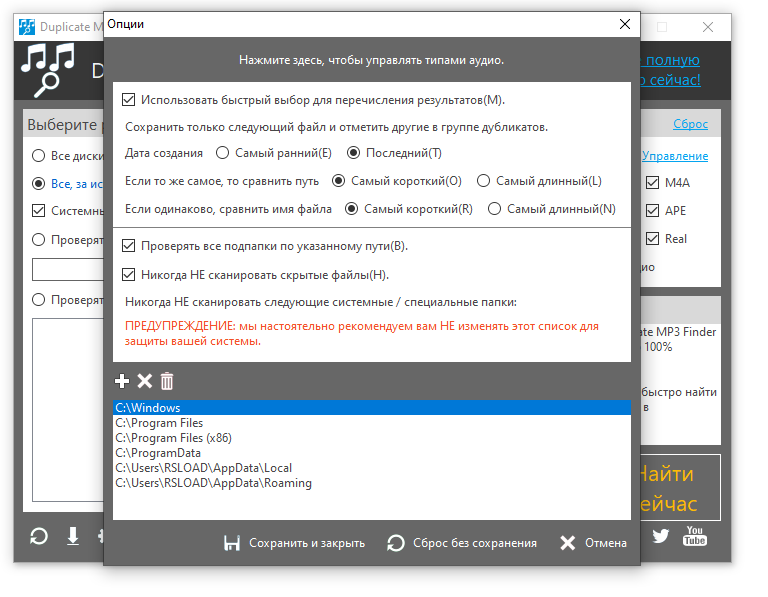 Программа использует продвинутые методы сравнения аудиоданных, что позволяет находить копии даже при различиях в имени, метке или формате.