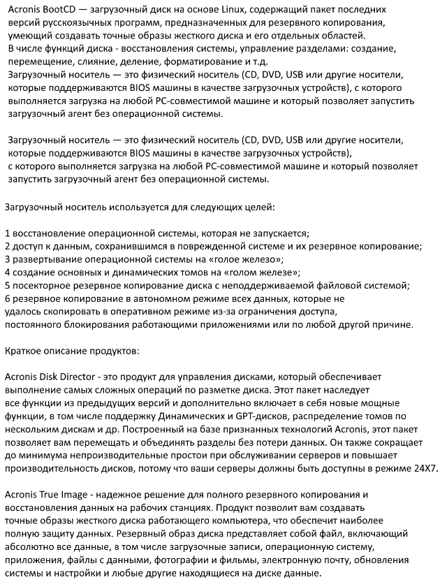 Acronis BootCD и BootDVD представляют собой загрузочные среды, объединяющие наиболее востребованные решения от компании Acronis. В составе присутствуют инструменты для создания резервных копий, управления разделами жёстких дисков, клонирования систем и восстановления после сбоев. Каждая версия, будь то BootDVD или BootCD, подготовлена с учётом стабильности работы и совместимости с современным оборудованием. Сборка была адаптирована для запуска с флешек, CD/DVD-дисков и других носителей, что делает её полезной при аварийном восстановлении.