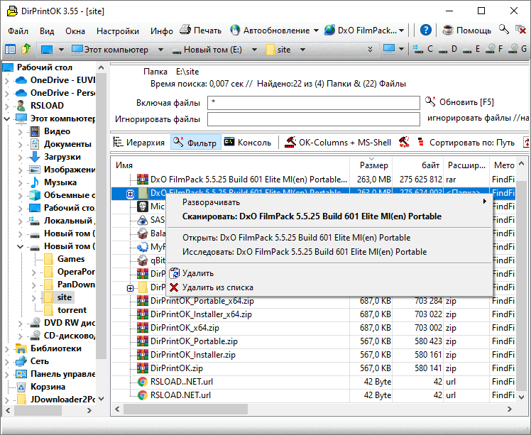 После запуска DirPrintOK пользователь сразу видит основное окно с деревом каталогов. Достаточно выбрать нужную папку, и программа автоматически отобразит все вложенные файлы и подпапки. Можно настраивать видимость колонок, изменять порядок сортировки, применять фильтры для отображения только определённых типов файлов. Например, можно оставить только документы или, наоборот, исключить временные файлы. Поддержка фильтров включает как положительные, так и отрицательные условия, что расширяет возможности анализа. Результат можно распечатать, сохранить в TXT, CSV или HTML, что удобно для архивирования или передачи информации коллегам.