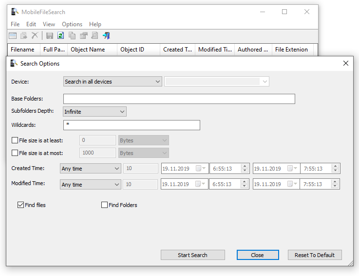 MobileFileSearch 1.50 разработана как универсальное решение для поиска файлов на мобильных устройствах, подключенных к компьютеру по USB. Программа совместима с любой версией Windows, начиная с Vista и заканчивая Windows 11, и поддерживает как 32-разрядные, так и 64-разрядные системы. Она не нуждается в установке и не использует дополнительные библиотеки DLL, что делает её полностью портативной — достаточно распаковать архив MobileFileSearch.zip и запустить исполняемый файл. После запуска открывается окно параметров, где пользователь может настроить критерии поиска и начать сканирование.
