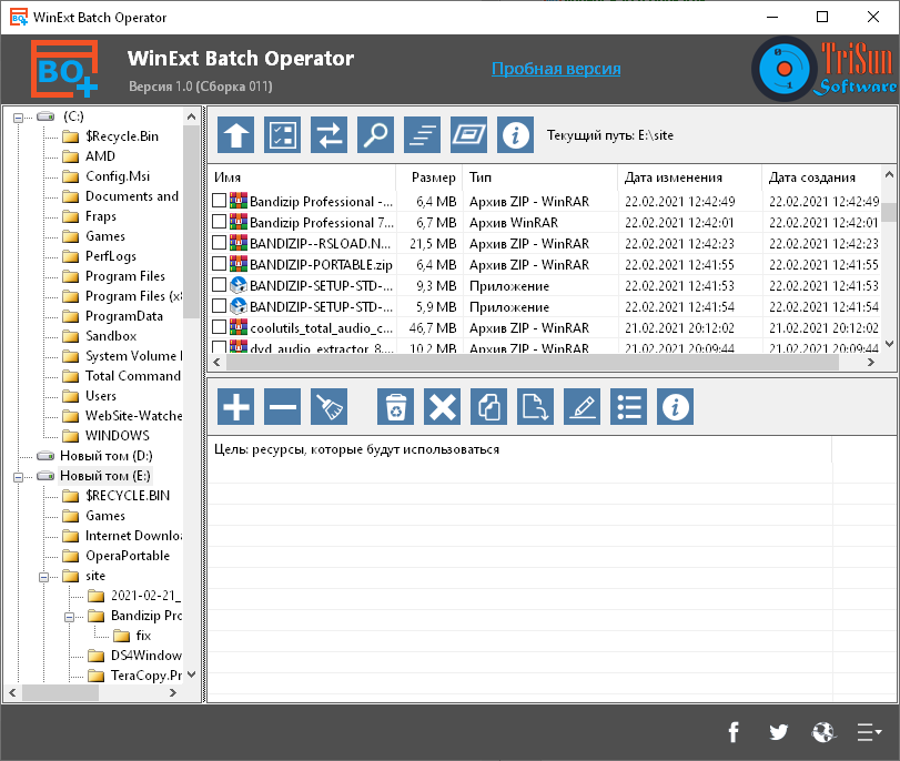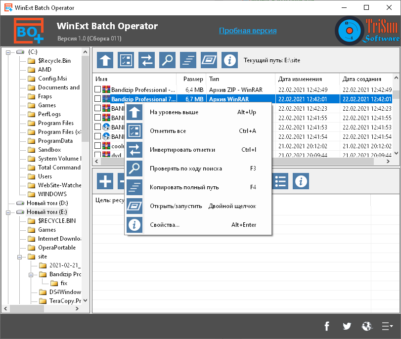 WinExt Batch Operator 2.0 Build 012 — это утилита для выполнения пакетных операций с файлами и папками в системе Windows, позволяющая автоматизировать управление данными: удаление, переименование, копирование, изменение атрибутов и свойств. Программа поддерживает русский интерфейс и работает на всех актуальных версиях операционной системы начиная с Windows 7. Решение от TriSun Software Inc. оптимизировано для быстрой обработки большого количества файлов без необходимости ручного вмешательства.