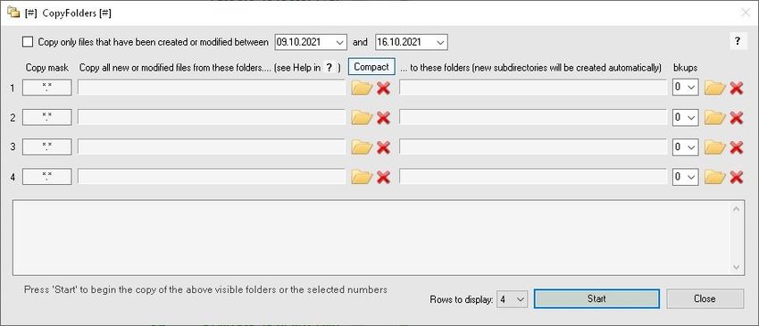 Для начала работы в соответствующие поля вносятся пути к папкам-источникам и папкам назначения. Если нужно скопировать содержимое только изменившихся файлов за определённый период, используется встроенный фильтр по датам. Достаточно установить флажок и указать временной диапазон. Приложение не создаст новые папки без необходимости, если это не требуется. Также есть возможность копировать данные в несколько конечных папок из одного источника. Это удобно при синхронизации данных на разных носителях. Кнопка «Compact» удаляет пустые строки, упрощая визуальное восприятие текущих настроек. Работа с copyfolder становится более эффективной, если задействовать автоматический запуск через системный планировщик. Это особенно полезно для регулярного резервного копирования без участия пользователя.