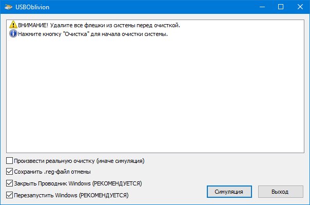 Чтобы начать использование USBOblivion, достаточно распаковать архив в удобную папку и запустить исполняемый файл. Перед началом очистки рекомендуется отключить все подключенные USB-устройства, чтобы избежать ошибок. После запуска приложения нужно нажать кнопку «Clean» — по умолчанию активируется симуляция очистки, в ходе которой отображаются все обнаруженные записи, но реальных изменений в системе не происходит. Чтобы выполнить реальное удаление, необходимо поставить галочку напротив пункта «Выполнить реальную очистку (имитация в противном случае)» и снова нажать «Clean». Все удаленные данные сохраняются в папке «Документы» в виде REG-файла, который можно использовать для восстановления, если это потребуется.