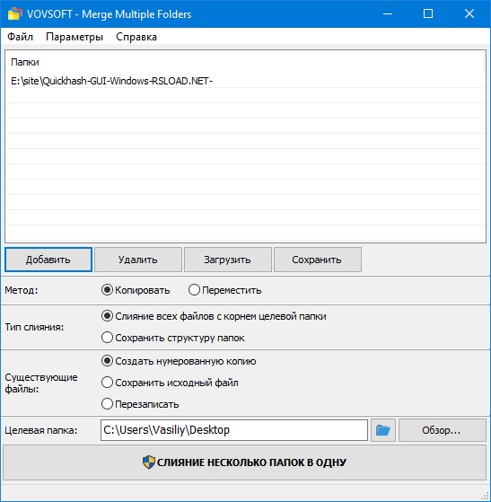 - Программа объединяет несколько папок в одну с сохранением иерархии