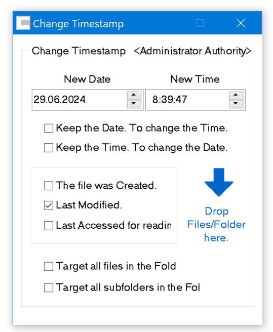 Change Timestamp — компактная и эффективная утилита для изменения временных меток файлов и папок в Windows. Программа позволяет редактировать даты создания, последнего изменения и доступа, обеспечивая точный контроль над системной информацией. Работает без установки, поддерживает пакетную обработку и предлагает интуитивный интерфейс для быстрого изменения timestamp.