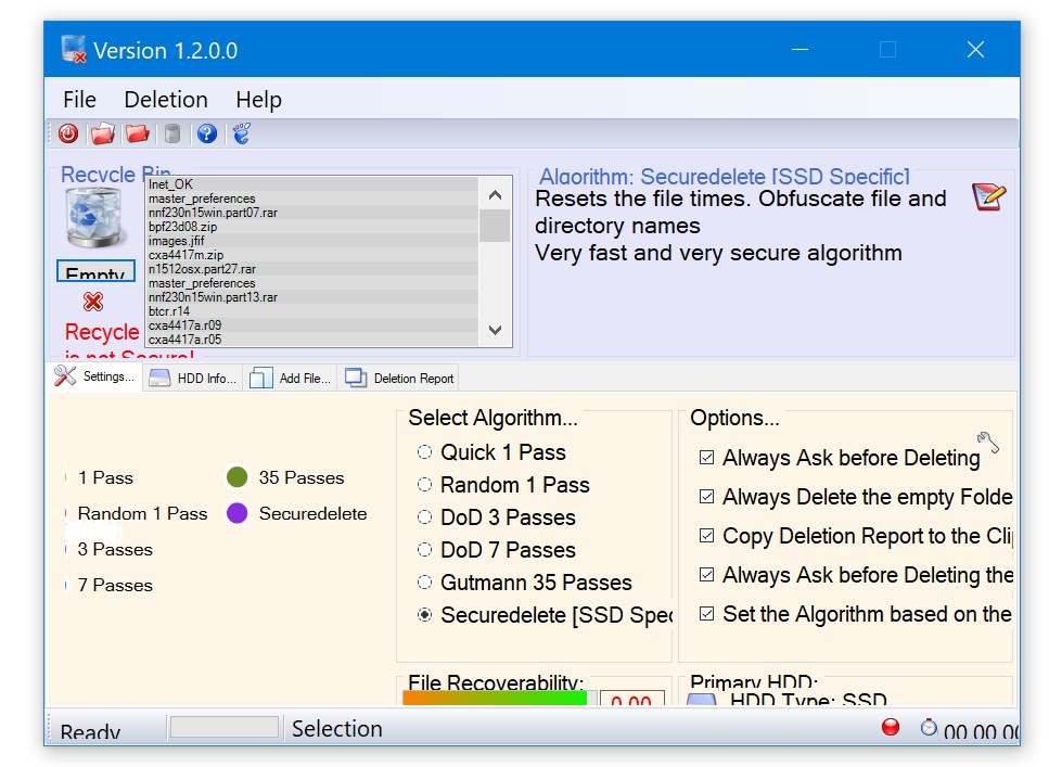 - Наличие нескольких алгоритмов шифрованного удаления файлов