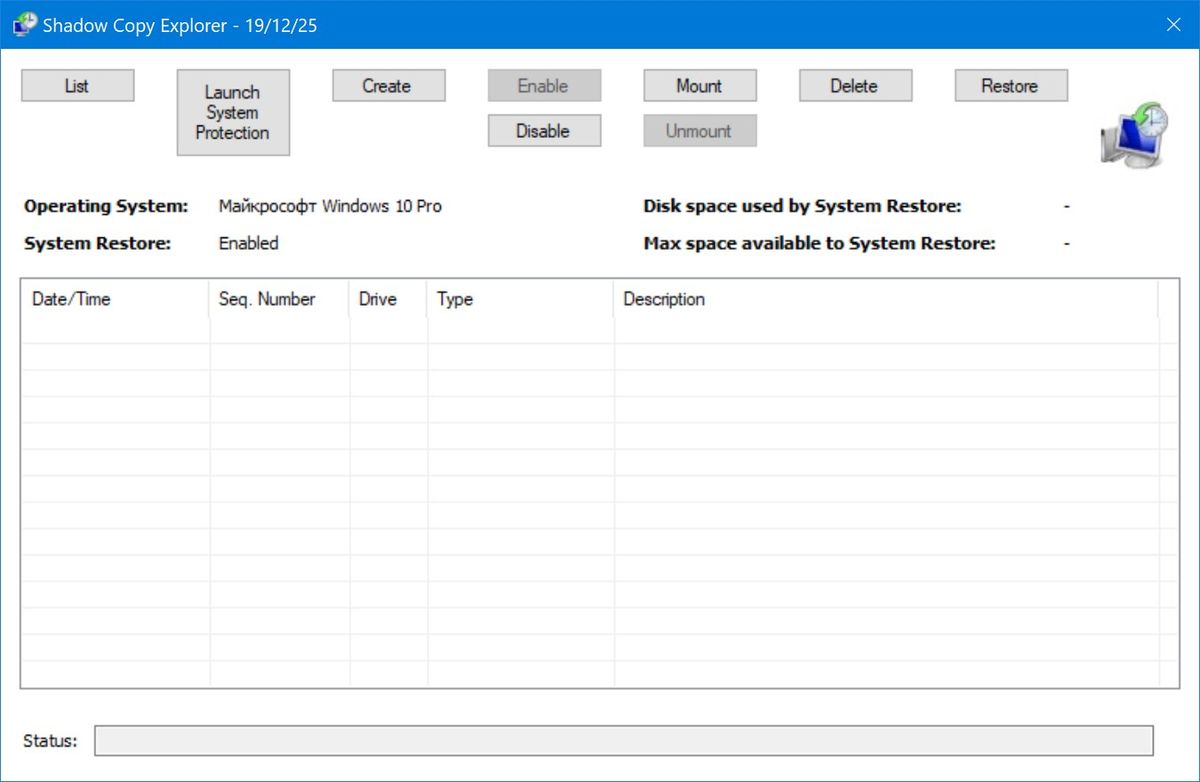 Использование программы предельно простое: после запуска утилита автоматически сканирует доступные тома на наличие теневых копий, созданных службой VSS. Пользователь может выбрать нужный снимок и смонтировать его как отдельный диск, после чего открывать его через стандартный проводник Windows. Из интерфейса доступна информация о времени создания снимка, его типе и источнике. Каждый файл можно предварительно просмотреть, сравнить с текущей версией и выполнить копирование нужных элементов на активный раздел. Даже при работе с повреждёнными томами утилита корректно обрабатывает метаданные, обеспечивая стабильный доступ к данным. Благодаря компактному размеру в 284 КБ, утилита запускается мгновенно и не нагружает систему.