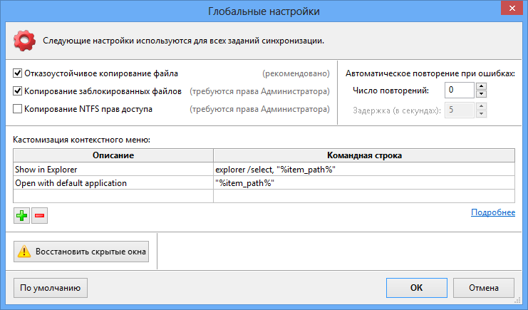- Гибкая настройка параметров синхронизации, включая фильтры, исключения и режимы обновления.