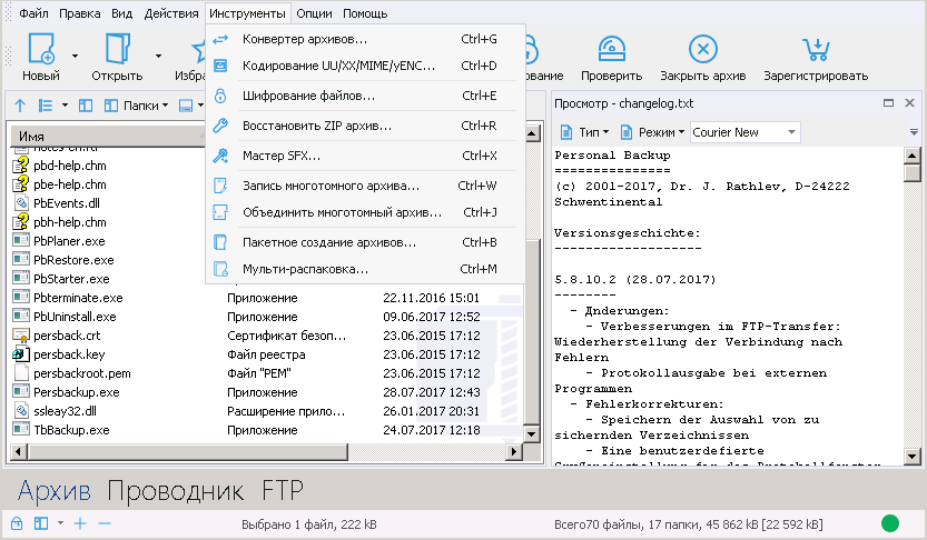 - Интеграция с FTP, возможность передачи архивов напрямую через программу