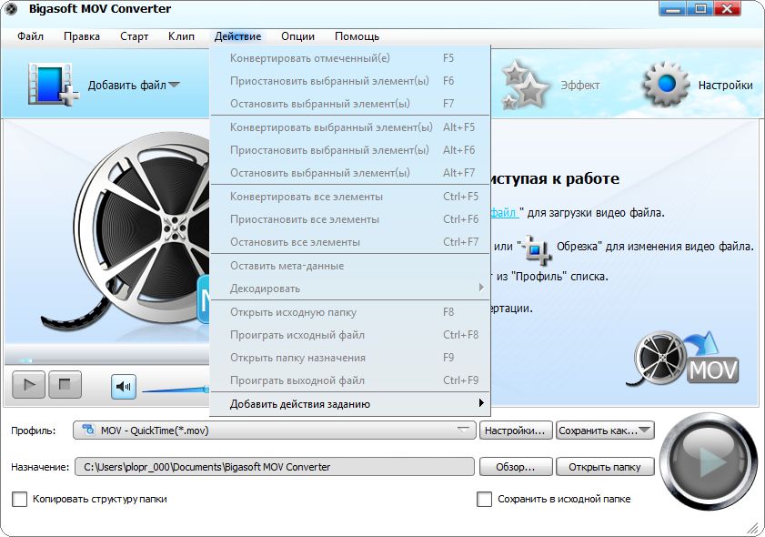 Работа с Bigasoft MOV Converter