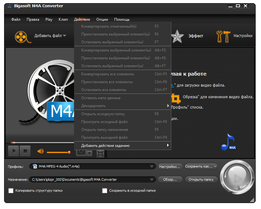 Пользование программой не требует специальных навыков. После запуска достаточно добавить нужные файлы, выбрать целевой формат — M4A, настроить параметры аудио или использовать стандартные профили. Программа позволяет обрезать аудиодорожки, изменять громкость, регулировать темп и устанавливать выходное качество. Поддержка drag-and-drop ускоряет процесс добавления файлов, а встроенное предпрослушивание помогает оценить результат до конвертации. После настройки запускается процесс преобразования, который проходит быстро даже при работе с большими файлами.