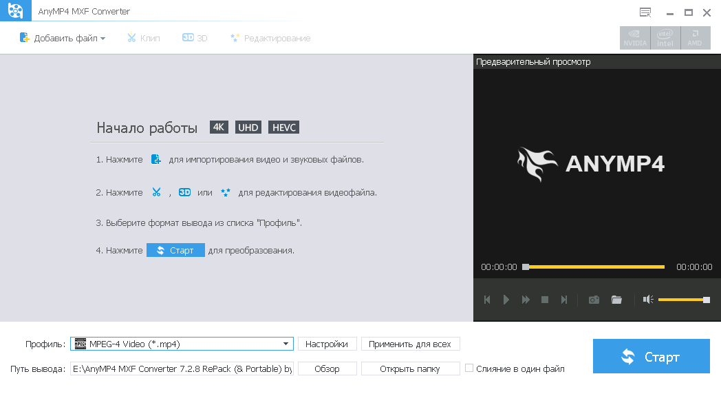 Работа с AnyMP4 MXF Converter