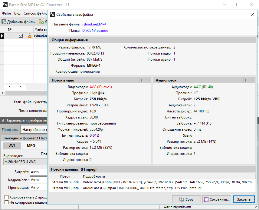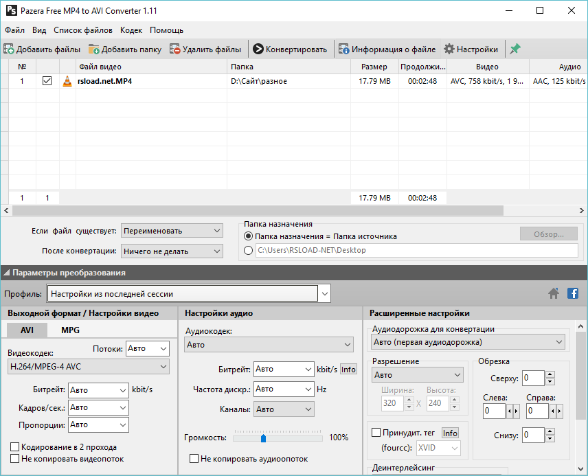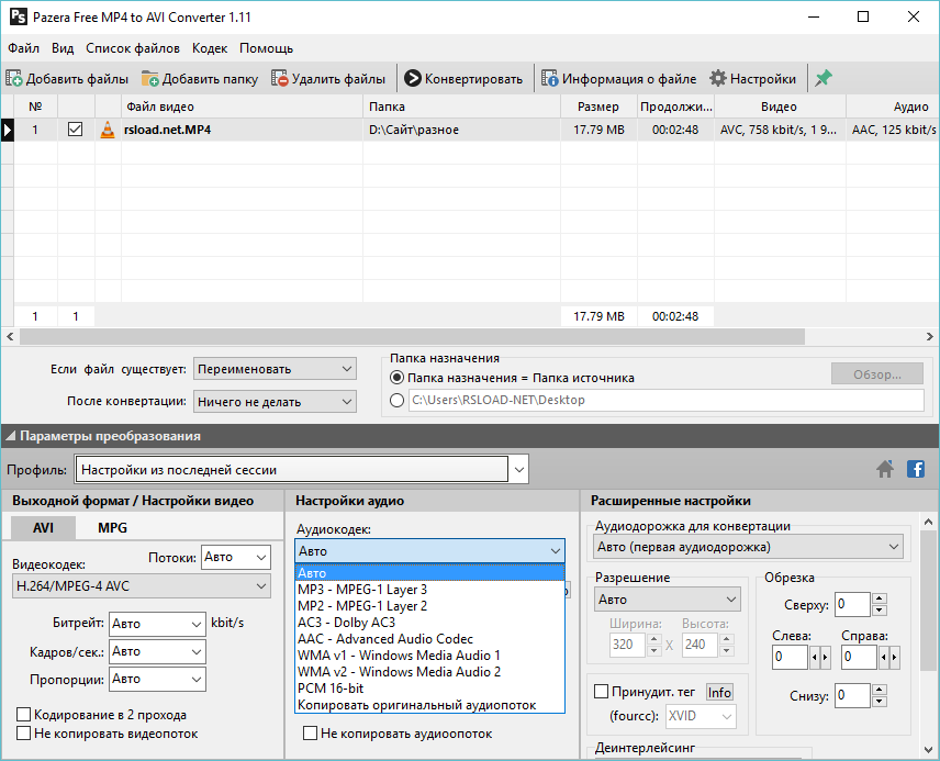 Работа с Pazera MP4 to AVI