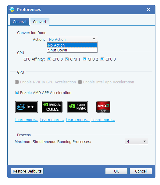 Программа использует ускорение конвертации с помощью видеокарт, что значительно сокращает время обработки
