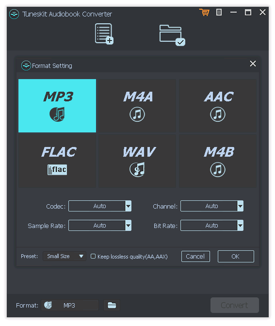 - Преобразование в MP3, AAC, WAV, FLAC, M4A, M4B