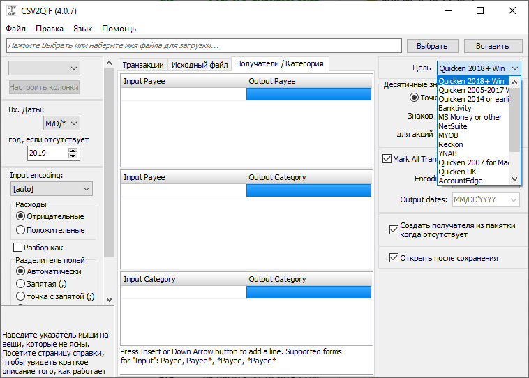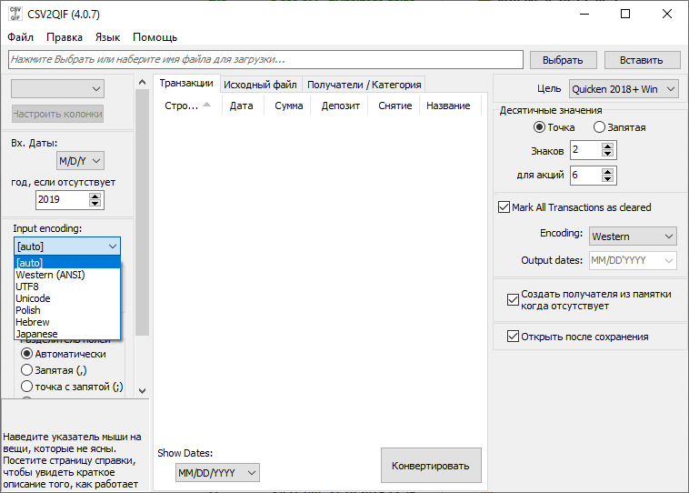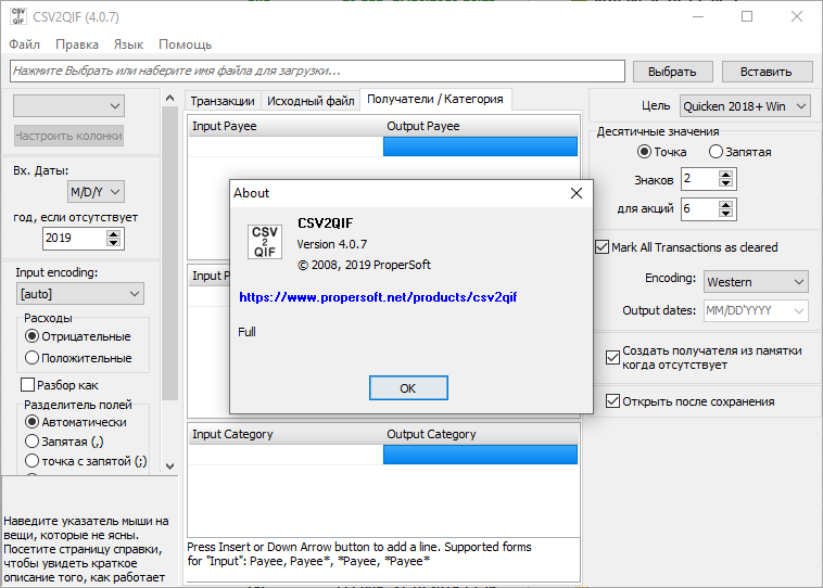 Программа CSV2QIF разработана компанией ProperSoft и предназначена для преобразования финансовых данных из текстовых и табличных форматов в формат QIF, используемый многими бухгалтерскими пакетами. Поддерживается работа с файлами CSV, TXT и Excel, что делает приложение универсальным решением для импорта транзакций. Важной особенностью является поддержка различных систем кодировок, включая UTF-8, UTF-7, Unicode, Big Endian Unicode, ANSI и ASCII, что исключает искажение кириллических символов при конвертации.