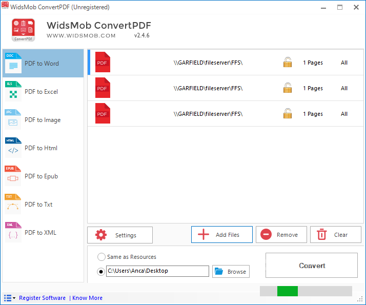 Интерфейс WidsMob ConvertPDF отличается простотой и логичной структурой. После добавления файлов в очередь отображается подробная информация: путь к файлу, количество страниц, статус защиты. Пользователь может выбрать тип конвертации и, при необходимости, настроить параметры, такие как формат Word — DOC или DOCX. Для HTML и текстовых файлов доступна опция объединения в один документ или разбивки по страницам. При конвертации в графические форматы поддерживаются JPEG, PNG, TIFF и EMF, что обеспечивает гибкость при подготовке материалов для публикаций или архивирования. На финальном этапе указывается папка для сохранения результатов, после чего запускается процесс преобразования. Программа работает стабильно, быстро обрабатывает документы и минимально нагружает систему. Благодаря встроенному механизм распознавания текста, даже отсканированные PDF конвертируются с высокой точностью.