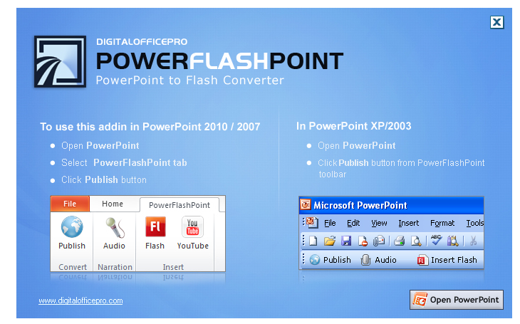 PowerFlashPoint разработана компанией DigitalOfficePro и предназначена для быстрой конвертации презентаций в формат Flash, обеспечивая высокую совместимость и качество вывода. После установки программа добавляет в PowerPoint отдельную вкладку, откуда доступны все основные функции: конвертация, настройка параметров экспорта и добавление интерактивных элементов. Пользователи могут задавать уникальные настройки для разных проектов, что особенно полезно при работе с большим количеством слайд-шоу.