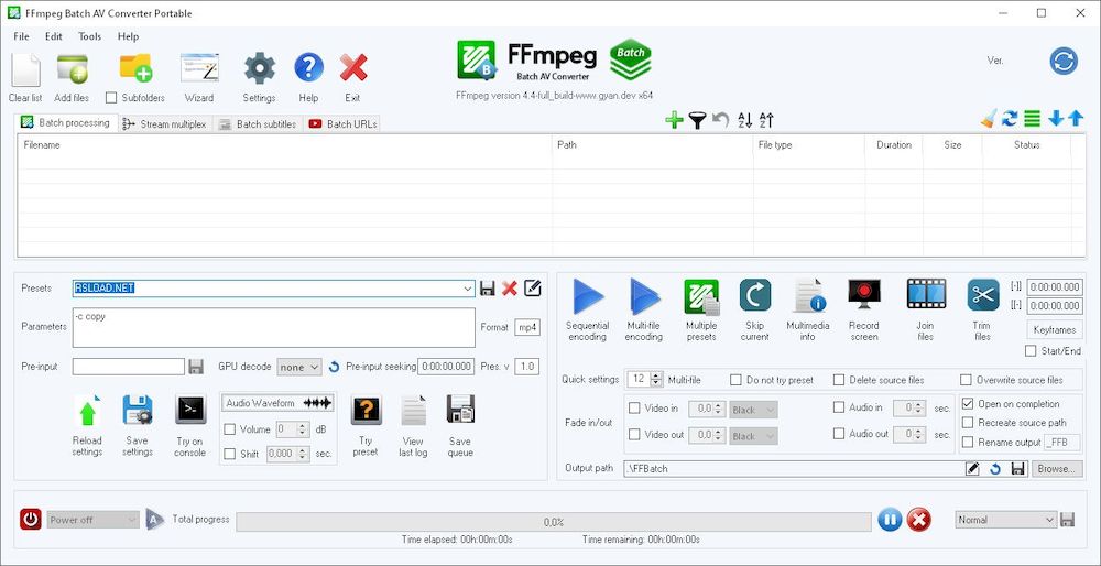 FFmpeg Batch A/V Converter 3.2.6 — портативная программа для пакетного преобразования видео и аудио с использованием мощного движка FFmpeg, обеспечивающая высокую гибкость настройки параметров перекодирования, обрезки, объединения файлов и работы с субтитрами.