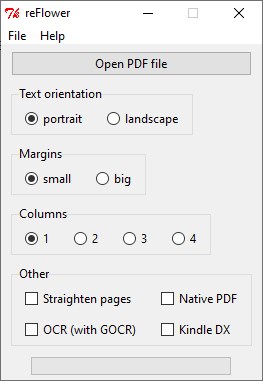 Интерфейс reFlower интуитивно понятен и не требует глубоких технических знаний. Для начала работы достаточно нажать кнопку Open File и выбрать нужный PDF. Ниже в интерфейсе отображаются все доступные параметры: можно задать нужное количество колонок, изменить размер полей, выбрать ориентацию страницы — портретную или альбомную. После настройки параметров запускается процесс конвертации, в ходе которого файл преобразуется с учетом заданных пользователем условий. При необходимости можно включить опцию выравнивания страниц и активировать OCR-обработку через GOCR, что особенно полезно для сканированных книг, где текст представлен в виде изображений.
