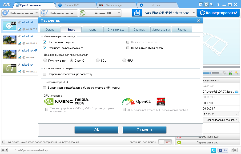 - Обеспечивает высокую скорость обработки видео за счёт аппаратного ускорения через видеокарту