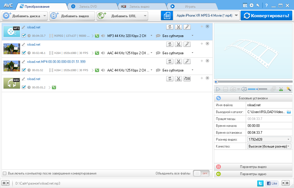- Работает в режиме пакетной конвертации с разными параметрами для каждого файла