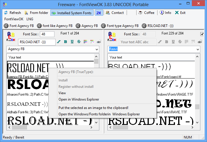 FontViewOK — это легковесное приложение, разработанное Nenad Hrg для удобного просмотра шрифтов, доступных в операционной системе. Утилита отображает полный список всех шрифтов, включая те, что установлены пользователем вручную. Интерфейс состоит из двух окон: в одном отображаются доступные шрифты, в другом — пример их применения на произвольном тексте. Это позволяет сразу увидеть, как будет выглядеть выбранная гарнитура в реальном контексте.