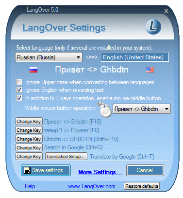 LangOver 5.8.00 — это компактная программа для исправления текста, случайно набранного в неверной раскладке клавиатуры. Утилита работает в автоматическом режиме и позволяет моментально конвертировать текст между различными языками ввода. Среди дополнительных функций — изменение регистра букв, реверсия строки и встроенный онлайн-переводчик.